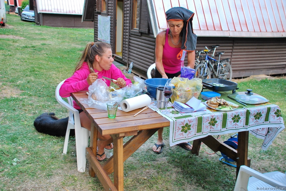Pan domácí nám půjčil z kempové jídelny stůl i s ubrusem abychom si mohli venku před vilkou udělat piknik. Naše Pamela peče jako divá a candát na másle s grilovanou cuketou, opečeným slunečnicovým chlebem s nivou a spoustou čerstvé zeleniny. A protože ryba musí plavat, zalili jsme candáta bílým i červeným vínem. Jdeme brzy spát abychom ráno vstali a v devět už byli na cestě. Jenže během noci se mi udělalo šoufl a já místo posilujícího spánku cirkuloval mezi postelí a záchodem.