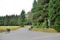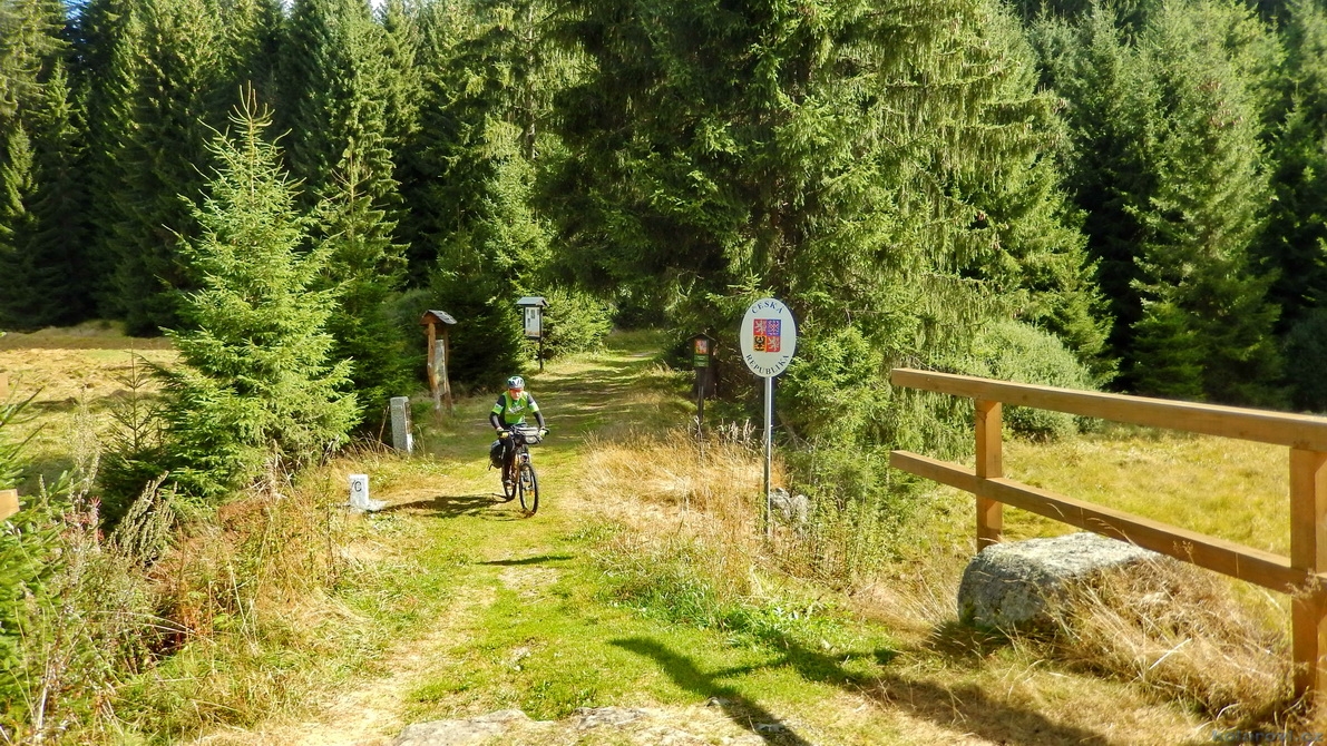 Nebe je od rána vymetené, teplota jak v srpnu - starousedlíci kroutí hlavou jak je v půli září krásně. Nám to samozřejmě vůbec nevadí, naopak. První zastávka byla v Českých Žlebech, kde jsme objevili bezvadnou hospodu s dobrým pivem, krásným výhledem po okolí a příjemným hospodským, který pouštěl řízný bigbít. Odtud stoupáme krajem, na který bůh zapoměl. Míjeli jsme několik památníků zaniklých vesnic, nikde ani živáčka - ten klid! Nějaké turisty potkáváme až když sjíždíme k hranicím. Za hranicem nás Německo přivítalo neuvěřitelným kopcem. Zplavení jsme vyšlapali na vrchol a s jazykem na vestě chvíli odpočíváme, pijeme - je docela teplo. Následuje sjezd a pak odbočíme do polí a do lesů, kde se cesta chvílemi ztrácí - Zuzanka už začíná nadávat. Po několika kilometrech jízdy občas pěšmo se dostáváme na silnici vedoucí zpět na hranice.