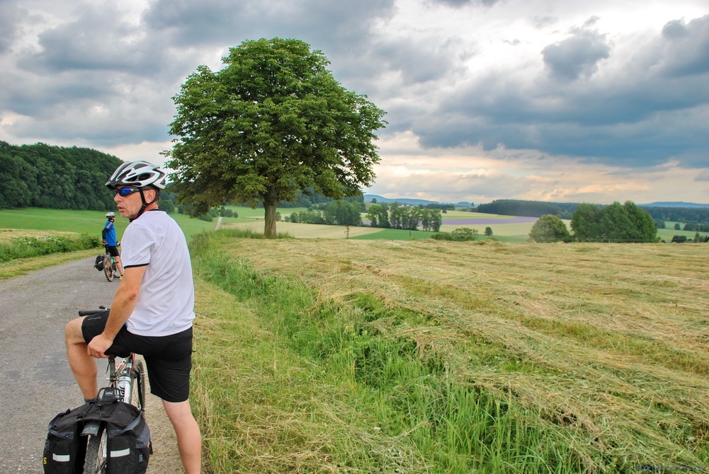 šlapeme do kopce, do svižného kopce a najednou se přehoupneme přes vrchol a šup! jsme v Německu. Následuje prudký sjezd, ve kterém jsme potkali uřícený německý pár tlačící kola opačným směrem do Čech. Druhý úsek Německem je snad ještě malebnější než ten první. V dáli vidíme typické vápencové rozeklané skály Saského Švýcarska. Jedeme krásnými údolími a lesními cestičkami až jsme najednou zase na hranicích. Překročili jsme je a kousek jedeme jako včera, Zuzanku už jímá hrůza, protože na téhle cestě Zuzanka trpěla. Naštěstí brzy odbočujeme na trochu kvalitnější cestu. Jedeme krásným lesem, pořád lehce stoupáme, ale cesta je kvalitní, jede se dobře. Po několika kilometrech se napojujeme na silnici a po ní je to do Brtníků co by kamenem dohodil.