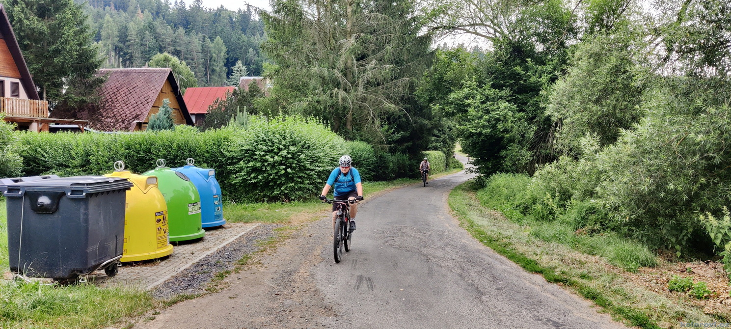Na Wodolenku jsme přijeli po jedné hodině odpoledne. Ubytovali jsme se a kolem třetí jsme v sedle a jedeme na tradiční úvodní výlet na "rozbruslení". Sjeli jsme na Hrádek, nejdříve po silnici a pak divočinou, hlubokým lesem. To byl kopec! Z Hrádku jedeme příjemnou okreskou trochu nahoru, drochu dolu, vše s krásnými výhledy. Stoupání ze Svojšic po cyklostezce, která je zároveň červená turistická, je velmi náročné. Sice zpevněná, ale kamenitá cesta, bez horského kola téměř nesjízdná. A ještě k tomu vedro jako v létě! K Wodolence jsme došlapali celkem vyflusaní.
