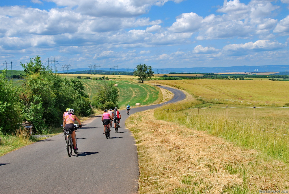Slunce pálí jako blázen, je vedro. Projíždíme roztomilými vesničkami, příjemnou krajinou. Zastavujeme u rybníku Velká Strana (pěkný název!), já se na chvíli natáhnul abych dobil baterky a Zuzanka snědla svoji svačinku, na kterou se vždy hrozně těší. Asi po půl hodině znovu sedáme na kolo, čeká nás závěrečná část cesty. Z Hrádku stoupáme a stoupáme a stoupáme... Napojujeme se na červenou turistickou ze Svojšic a stekně jako včera pereme se s kamenitou cestou. Moje "bodybattery" mele z posledního. Do Wodolenky jsem dorazil s nulovou kapacitou, tak říkajíc, dojel jsem na "benzínové výpary".