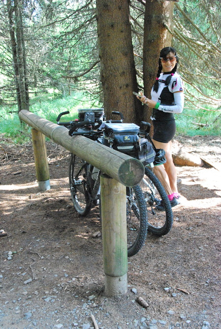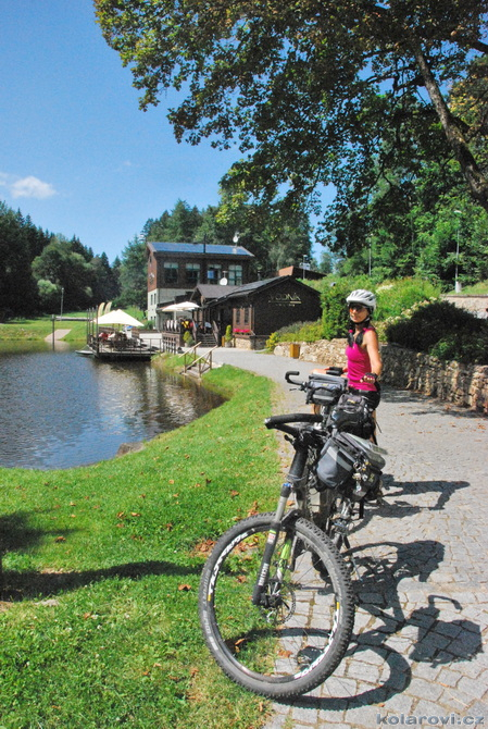 Je krásné ráno, sice chladno, ale svítí sluníčko. Chystáme se na nejdelší a nejnáročnější trasu do Vimperku. Cestou se stavujeme v pekárně Kvilda pro borůvkový, s lesními plody a tvarohovo-hruškový koláč. První zastávka je u Jezerní slati, (byli jsme tu před rokem) a pak pokračujeme do lesů směr Zadov. Před Zadovem musíme měnit trasu, protože žlutá turistická fakt není sjízdná. Nakonec jsme dojeli k rozhledně Churáňov, která je udělaná ze skokanského můstku. Vylezli jsme na rozhlednu (i já!) odkud je opravdu pěkný výhled po kraji. Další fakultativní odbočka z trasy je jezírko Nový Kyz, zatomený lom po těžbě křemeliny, která se drtila na prach, ze kterého se v hutích tavilo sklo. Následný sjezd přerušovaný občasnými "dokopečky" je dlouhý asi 12 kilometrů a zavedl nás až do Vimperka. Za zmínku stojí objížďka frekventované silnice po červené turistické, která připomíná singltrekovou trasu. Míříme k první zastávce ve výletní restauraci Vodník, v bývalé plovárně Vodník a u rybníku Vodník. Téměř romantické zastaveníčko na terase s krásným výhledem na rybníček. Čeká nás docela přísný výšlap, dáváme si jeden salát s haloumi sýrem dohromady aby jsme se při jízdě do kopce nepoblinkali. Ufff...! Kopec byl opravdu strašný! Z Vimperku jsme se hrabali kamenitou cestou se sklonem 15%, kola jsme místy statečně vedli. Až v Klášterci začínala sjízdná cesta, nejdříve štěrková, pak mlatová a nakonec asfaltová. Sklon se ještě zvýšil na 17%. V Lipové jsme měli mít zastávku, my nemáme na jídlo ani nic jiného pomyšlení a když jsem si prohlédl další profil trasy, rozhodl jsem, že jedeme dále. Dobře jsem udělal, opět 17% stoupání. Přežili jsme a frčíme z kopečku do Borové Lady, kde jsme se konečně zastavili v hospůdce. Tentokrát U Černého vlka, kde snad čepují lepší pivo. Po tomto výkonu, co máme za sebou, je i sudová Plzeň lahodná.