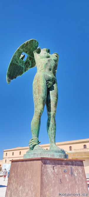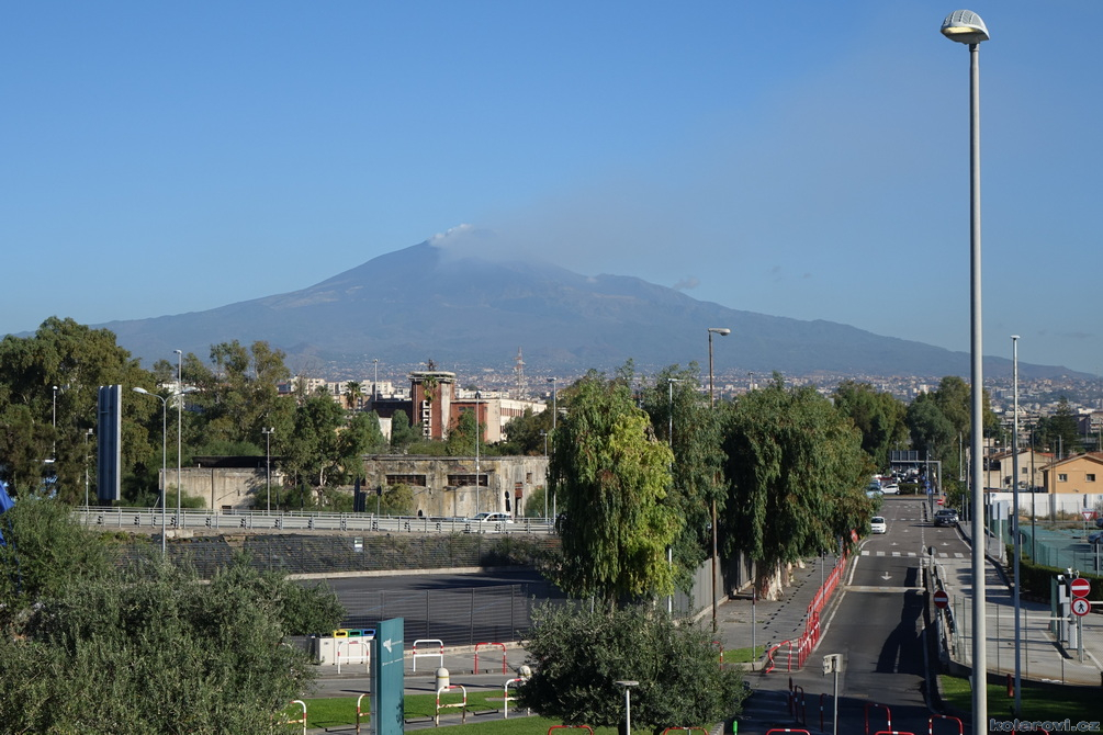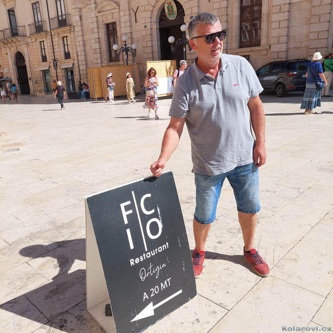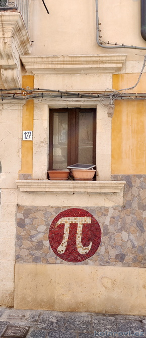 Přistání v Catanii bylo drsnější, pilot s námi flákl o zem až v nás zapraštělo, ale jinak let probíhal v pohodě i pro nás neletce. Hned na letišti se převlékáme do letního, protože z Pražských 10 °C jsme rázem v letních pětadvaceti. Krátce po deváté už fotíme Etnu a čekáma na našeho řidiče a pana domácího v jedné osobě. Čeká nás cesta do Syrakus, kde je dnes první kulturní zážitek. Karel je tu se svým "autobusem" značky VW Transporter, kam se v pohodě vejdeme. V kufru poslušně leží Karlovi psi Fjord a Zweite. Krátce po desáté Karel parkuje v Syrakusách, v rodišti Archiméda ze Syrakus (starořecky Αρχιμήδης, 287 př. n. l. – 212 př. n. l.). Archimédés jako první vědecky vypočítal přibližnou hodnotu π pomocí geometrické metody, která spočívala v tom, že vepsal do kruhu a opsal kolem něj pravidelný mnohoúhelník. Postupným zvyšováním počtu stran (až na 96úhelník) zjišťoval obvod mnohoúhelníků, čímž sevřel hodnotu π mezi dva zlomky. Dokázal, že π je větší než 3 10/71 a menší než 3 1/7, tedy přibližně 3,1408<π<3,1429.