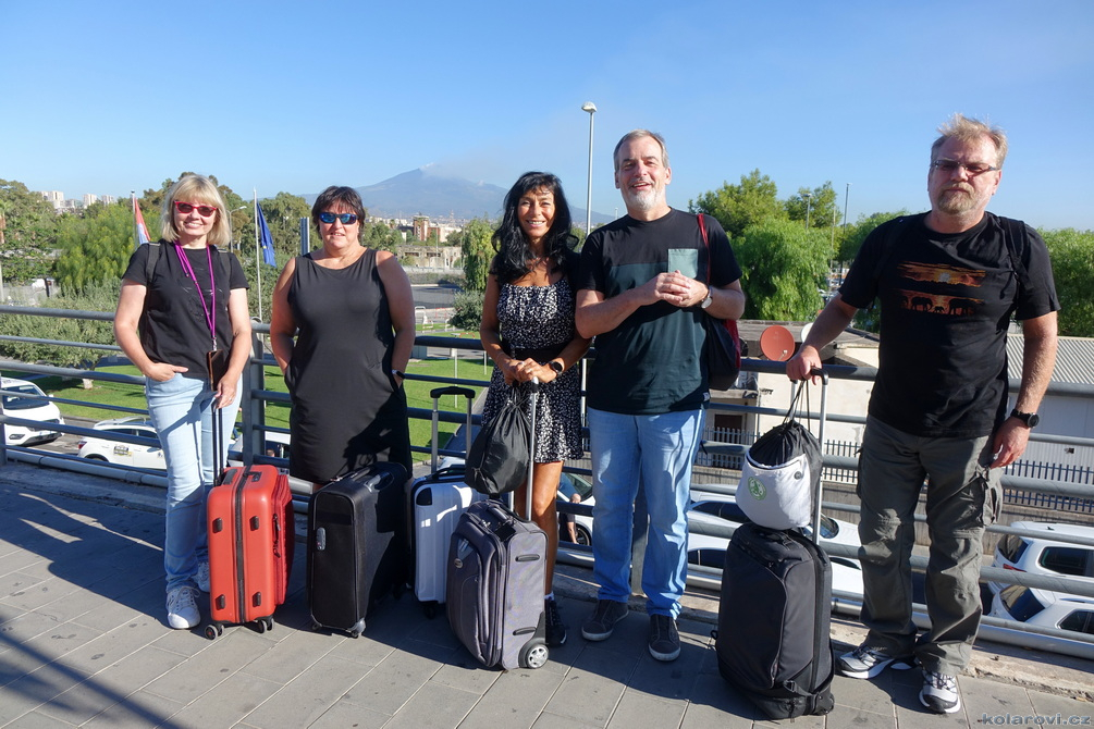 Být v půl páté ráno na Letišti Václava Havla je násilí páchané na mé osobě. Spolu se Zuzankou nás na Spořilově vyzvedla Hanka, kterou vezl do Ruzyně její hodný manžel. Na letišti je celkem pusto, nás šest se v té prázdnotě celkem ztrácí. Máme s sebou jen palubní zavazadla, nemusíme jít k odbavení a tak v pohodě nastupujeme do letadla, které se v 6:30 hodin ráno zvedá z ranveje k obloze a letíme dobrodružství vstříct. Ivana, Hanka, Helena, Zuzanka, Jirka a má drobnost, za Karlem, na Sicílii, do Grotte...