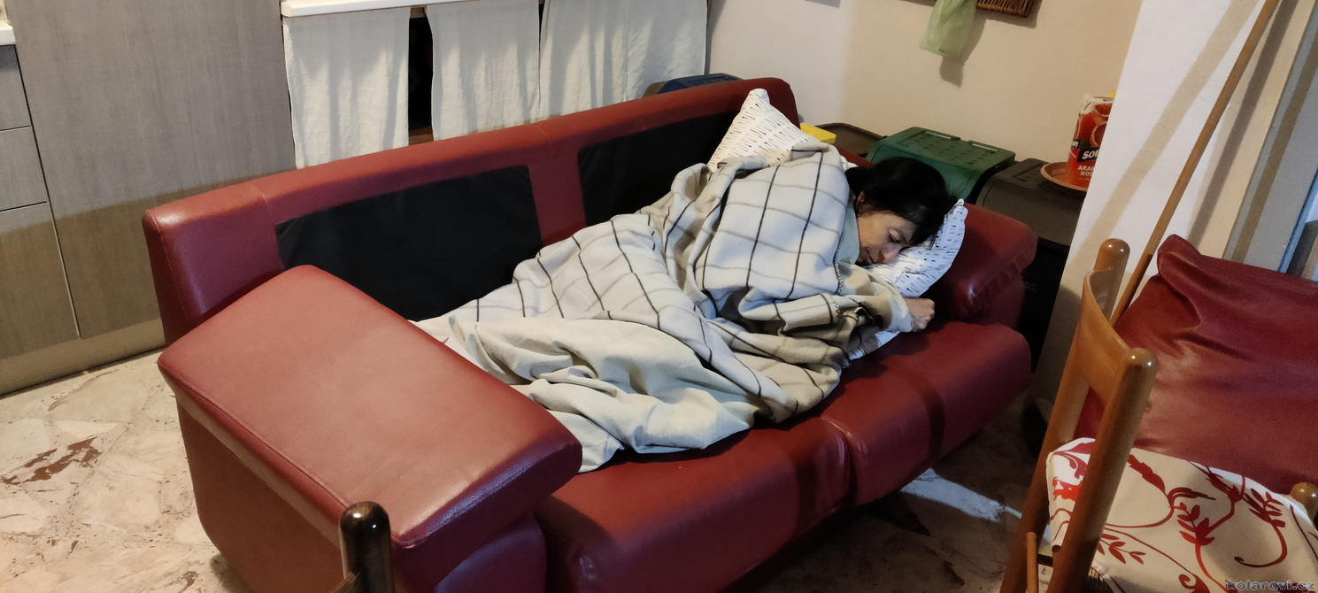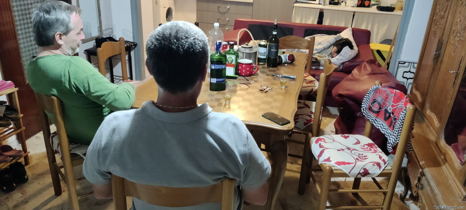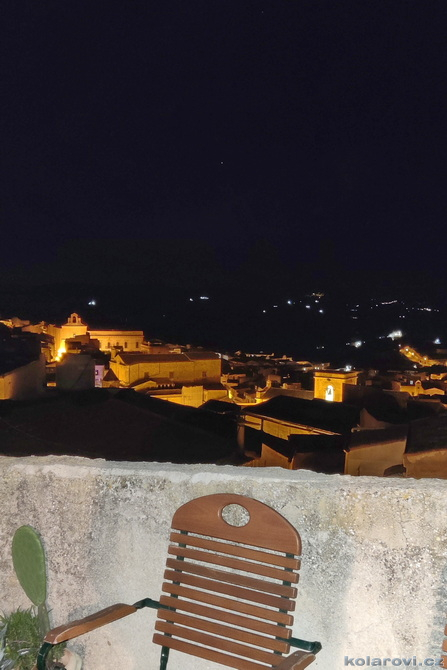 Cesta z Noto byla celkem úmorná, ale nakonec jsme v Grotte a Karel nám zastavil u supermercata, kde jsme si nakoupili večeři, snídani a chlast. Karlova chata je úzký domeček v řadě jiných úzkých domečků, čtyři podlaží vysoká, v nejvyšším s terasou a krásným výhledem po celém kraji. Ještě před večeří jsme museli z protějšího domu, který vlastní známá Karla, přestěhovat jednu postel aby i sedmá osoba z našeho zájezdu měla kam hlavu složit. Škoda, že naše posouvání postele přes balkóny obou domů nikdo nenafilmoval. Postel nakonec putovala do dámské ložnice ve 2. NP a tak i Zuzanka má kde spát. Tento zájezd kopíruje procentuelní složení v našem kruhu, kdy v něm bylo vždy více holek než kluků. Zde je to čertovo plémě v přesile 4:3. Povečeřeli jsme a začali si připíjet na všelico. Dámy postupně odpadali a tak jsme zbyli tři mohykáni a postupně trestáme všechny flašky s alkoholem co potkáváme. Kolem třetí hodině ráno, kdy bylo téměř vše vypito, se z dámské ložnice i s peřinkou zjevila Zuzanka a požádala o azyl. Její spolunocležnice prý vydávají zvuky podobné motorové pile a ona se bojí.