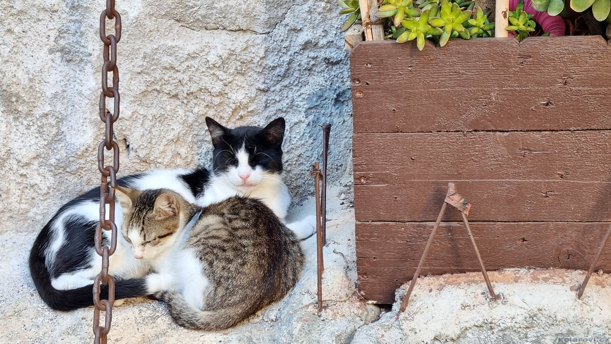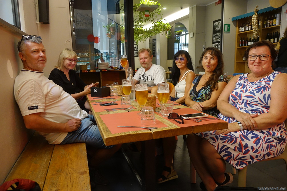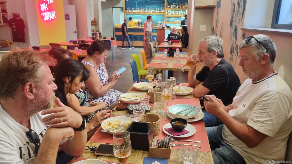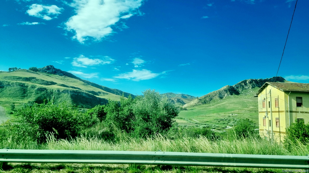Krasojízda se trochu zadrhla. Helena měla v plánu navštívit nějakou vesnici, kde se točil jakýsi kultovní film a tak místo po dálnici jedeme šílenými okreskami, které místy mizely po nánosem bordelu, sesuvy krajnic a výtluky zvící jako chřtány ošklivé příšery. Stmívá se, nakonec do vesnice nejedeme a kodrcáme se do Grotte. Dorazili jsme sice pozdě, ale šťastní, že jsme přežili. Ostatně, co tě nezabije, to tě posílí. Ještě jsme stačili nakoupit, a pak už nic nebrání si trochu užít zbytek večera.