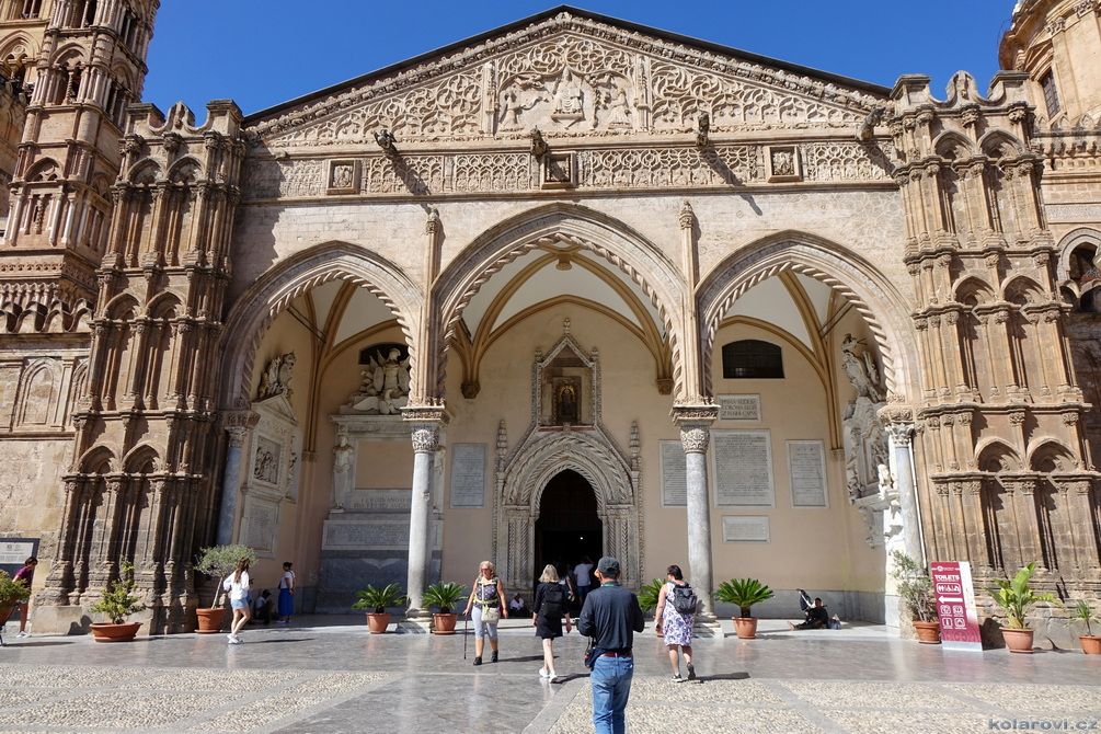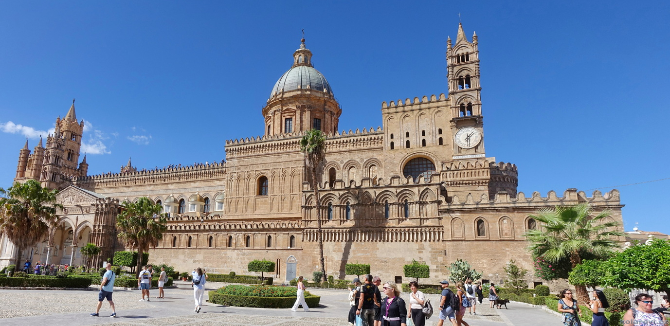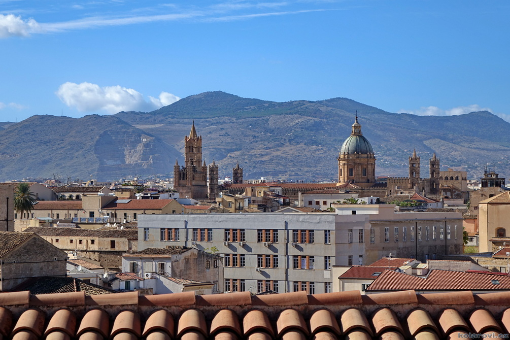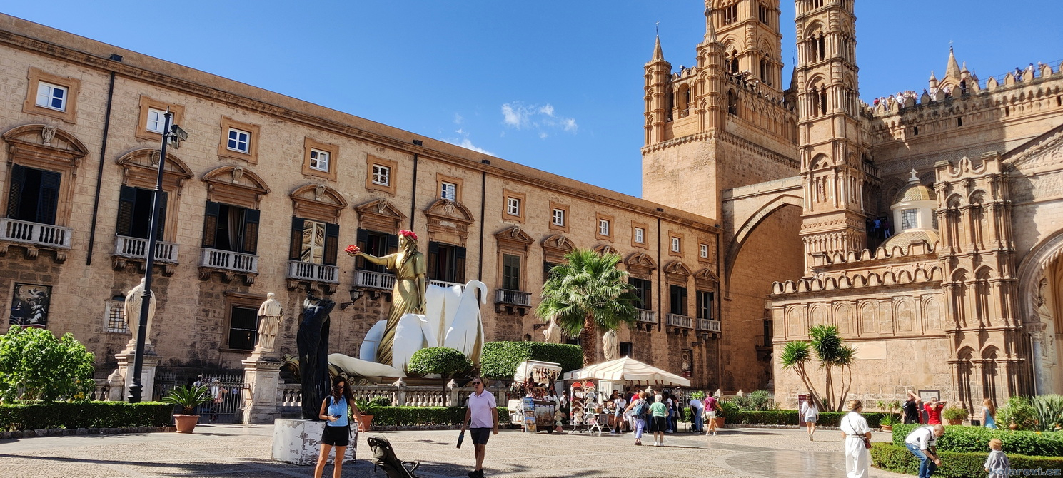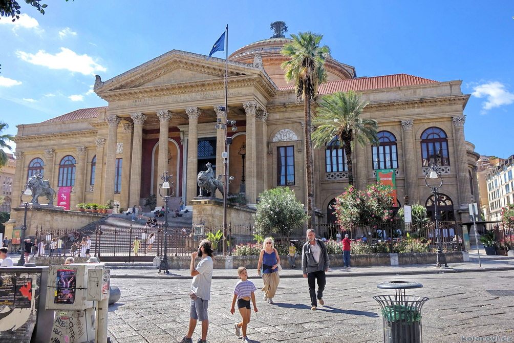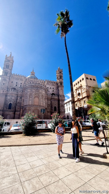 Asi tak dvě hodiny cesty nás dělí od cíle dnešního programu a tím je prohlídka Palerma, města pro neznalého našince spojeného pouze s mafií a organizovaným zločinem. Dnes je opravdu vedro, jako u nás v nejprudším létě. Palermo je celé rozpálené, nejdříve parkujeme na pobřeží aby Karel mohl vyvenčit pejsky a my se jukli na hospodu Marino Da Minichello, která je vyhlášená přípravou specialit s mořských tvorů. Nebylo to nic moc, ještě měli zavřeno ani jsme si nemohli dát kávu, či něco jiného. Na Italy je moc brzo, jediné otevřené bistro v okolí byla jakási samoobsluha s mimoni u pultu i u kasy. Pejskové jsou vyvenčeni, my napojeni a znovu skáčeme do "autobusu" a míříme do historického středu Palerma. Najít parkování je snad ještě obtížnější než v centru Prahy. Nakonec Karel našel místo, které bylo ve stínu a poloha zaručovala, že tam nějakou dobu vydrží, neboť se Karel rozhodl, že pejskové budou bydlet v autě. Brousíme po historickém centru Palerma, míjíme skvosty italského baroka jako například Teatro Massimo Vittorio Emanuele, což je největší operní dům v Itálii a jeden z největších v Evropě, kostel sv. Augustina v srdci čtvrti Capo, na Via Sant'Agostino jsme prošli trh s látkami, až jsme doputovali ke katedrále Nanebevzetí Panny Marie (Duomo di Palermo), oficiálně nazvaný Bazilika Metropolitana Primaziale della Santa Vergine Maria Assunta. Jedná se o hlavní bohoslužebný prostor města a arcibiskupské sídlo, zařazen do památky UNESCO „Palermo arabo-normanna“. Začal nás trápit hlad. Nedařilo se nám najít vhodnou hospůdku na jídlo, na všech, které jsme při trochu zmateném pobíhání potkávali, nám vždy něco vadilo a nakonec jsme už docela žízniví a hladoví nalezli poněkud alternativní bistro Moltivolti na Via San Giuseppe Mario Puglia. Vybrali jsme nakonec dobře. Jídlo bylo chutné, ne drahé a prostředí příjemné.