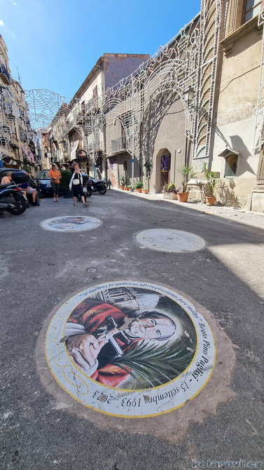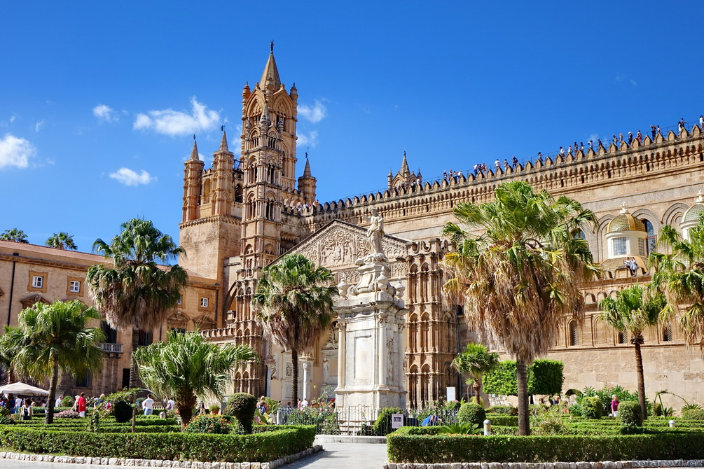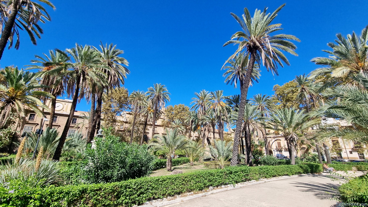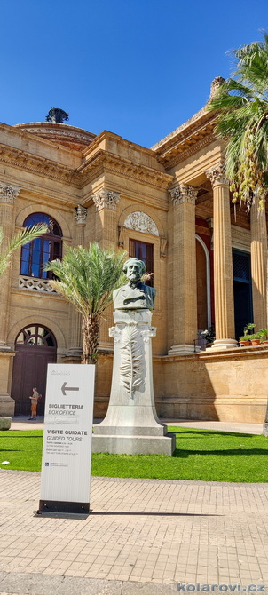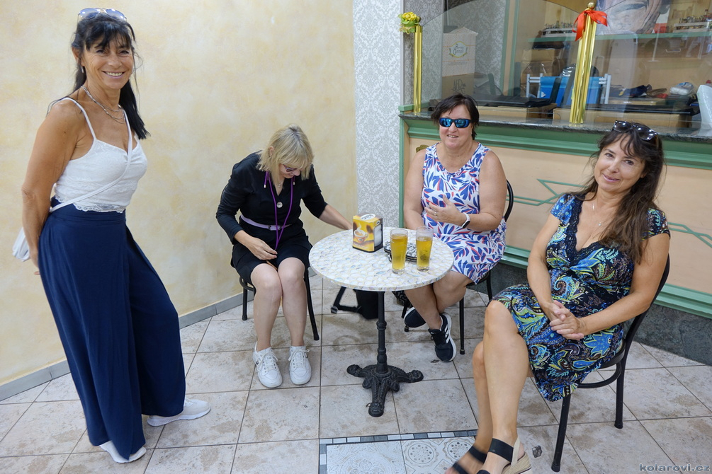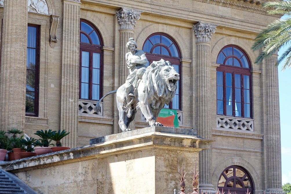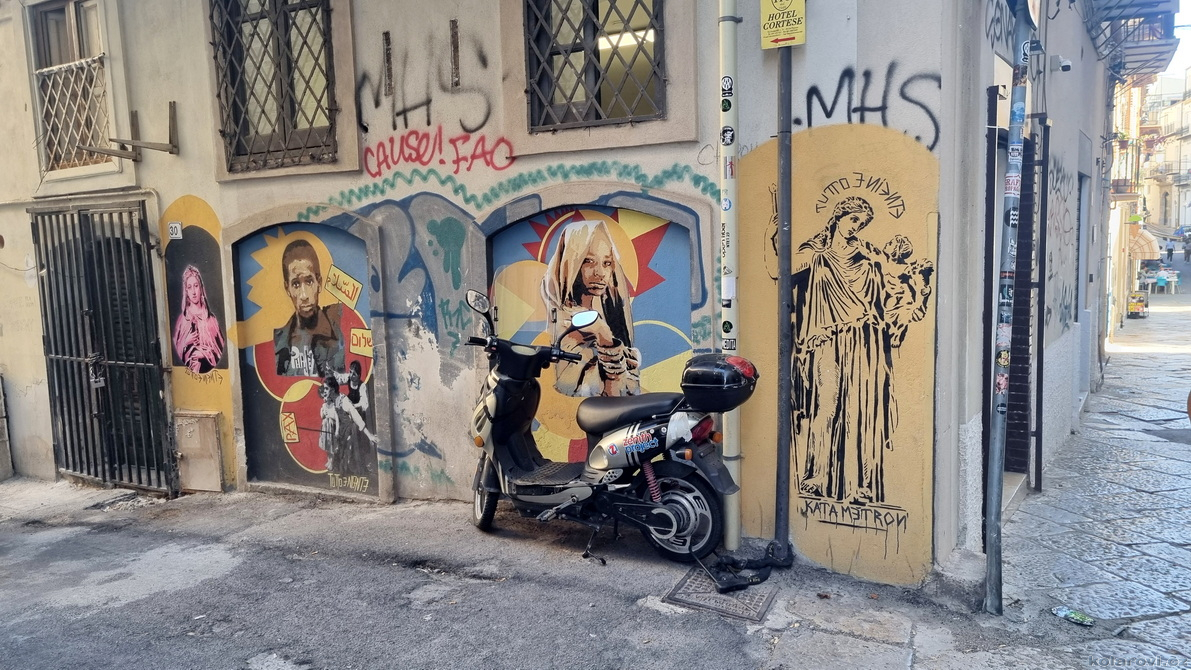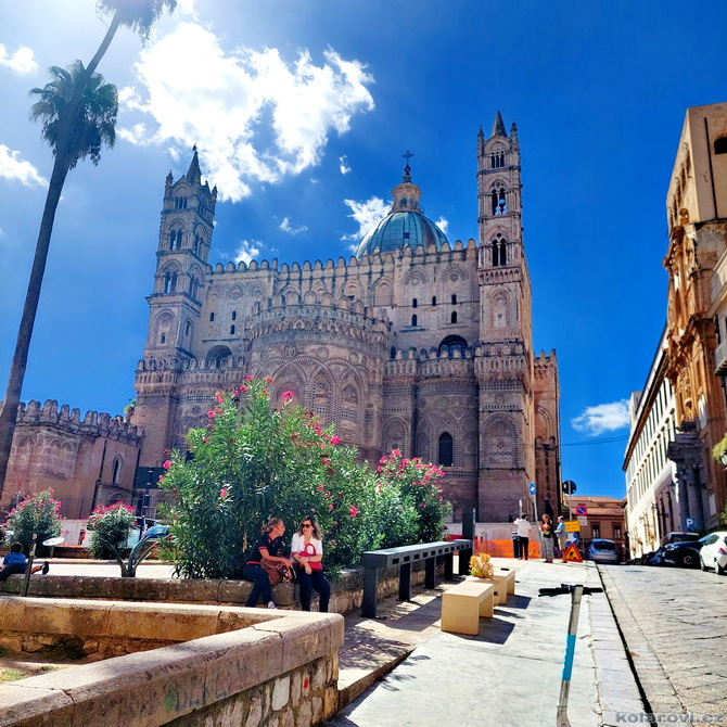 Asi tak dvě hodiny cesty nás dělí od cíle dnešního programu a tím je prohlídka Palerma, města pro neznalého našince spojeného pouze s mafií a organizovaným zločinem. Dnes je opravdu vedro, jako u nás v nejprudším létě. Palermo je celé rozpálené, nejdříve parkujeme na pobřeží aby Karel mohl vyvenčit pejsky a my se jukli na hospodu Marino Da Minichello, která je vyhlášená přípravou specialit s mořských tvorů. Nebylo to nic moc, ještě měli zavřeno ani jsme si nemohli dát kávu, či něco jiného. Na Italy je moc brzo, jediné otevřené bistro v okolí byla jakási samoobsluha s mimoni u pultu i u kasy. Pejskové jsou vyvenčeni, my napojeni a znovu skáčeme do "autobusu" a míříme do historického středu Palerma. Najít parkování je snad ještě obtížnější než v centru Prahy. Nakonec Karel našel místo, které bylo ve stínu a poloha zaručovala, že tam nějakou dobu vydrží, neboť se Karel rozhodl, že pejskové budou bydlet v autě. Brousíme po historickém centru Palerma, míjíme skvosty italského baroka jako například Teatro Massimo Vittorio Emanuele, což je největší operní dům v Itálii a jeden z největších v Evropě, kostel sv. Augustina v srdci čtvrti Capo, na Via Sant'Agostino jsme prošli trh s látkami, až jsme doputovali ke katedrále Nanebevzetí Panny Marie (Duomo di Palermo), oficiálně nazvaný Bazilika Metropolitana Primaziale della Santa Vergine Maria Assunta. Jedná se o hlavní bohoslužebný prostor města a arcibiskupské sídlo, zařazen do památky UNESCO „Palermo arabo-normanna“. Začal nás trápit hlad. Nedařilo se nám najít vhodnou hospůdku na jídlo, na všech, které jsme při trochu zmateném pobíhání potkávali, nám vždy něco vadilo a nakonec jsme už docela žízniví a hladoví nalezli poněkud alternativní bistro Moltivolti na Via San Giuseppe Mario Puglia. Vybrali jsme nakonec dobře. Jídlo bylo chutné, ne drahé a prostředí příjemné.