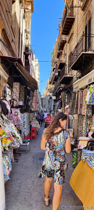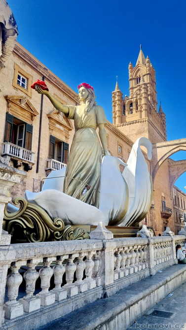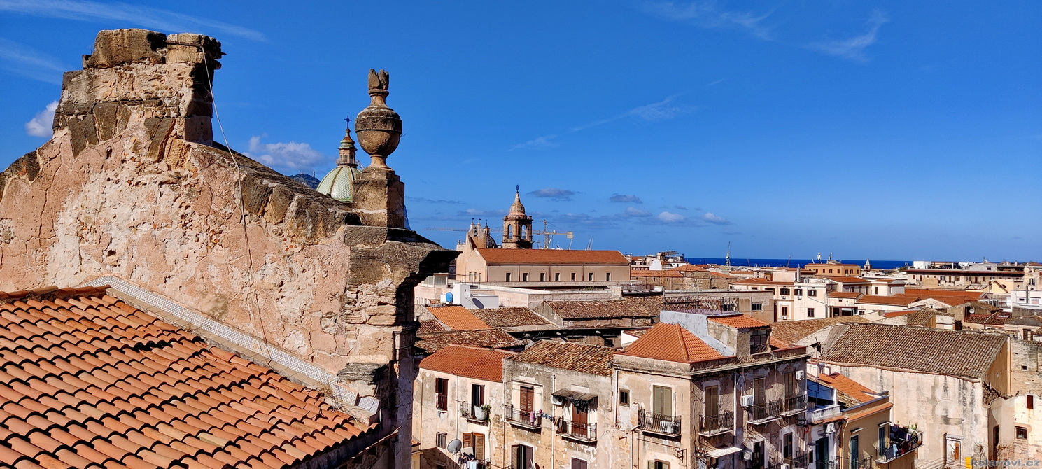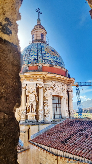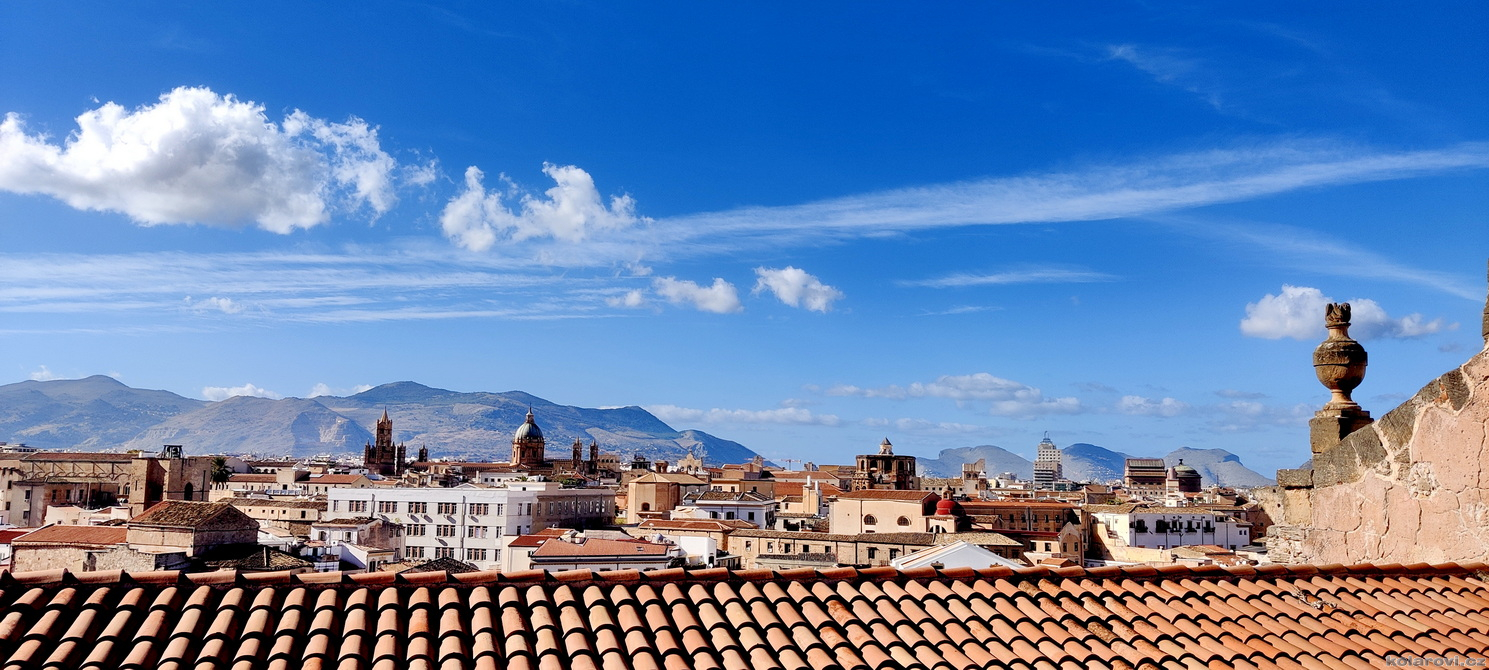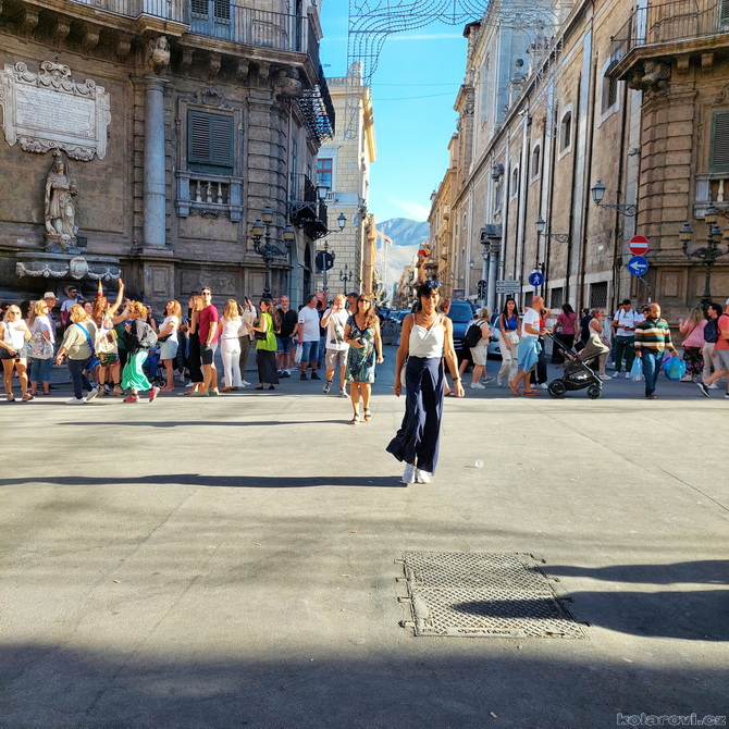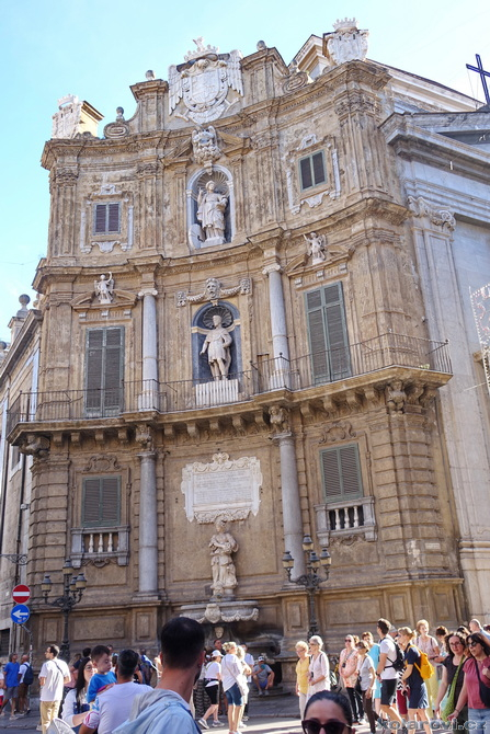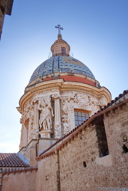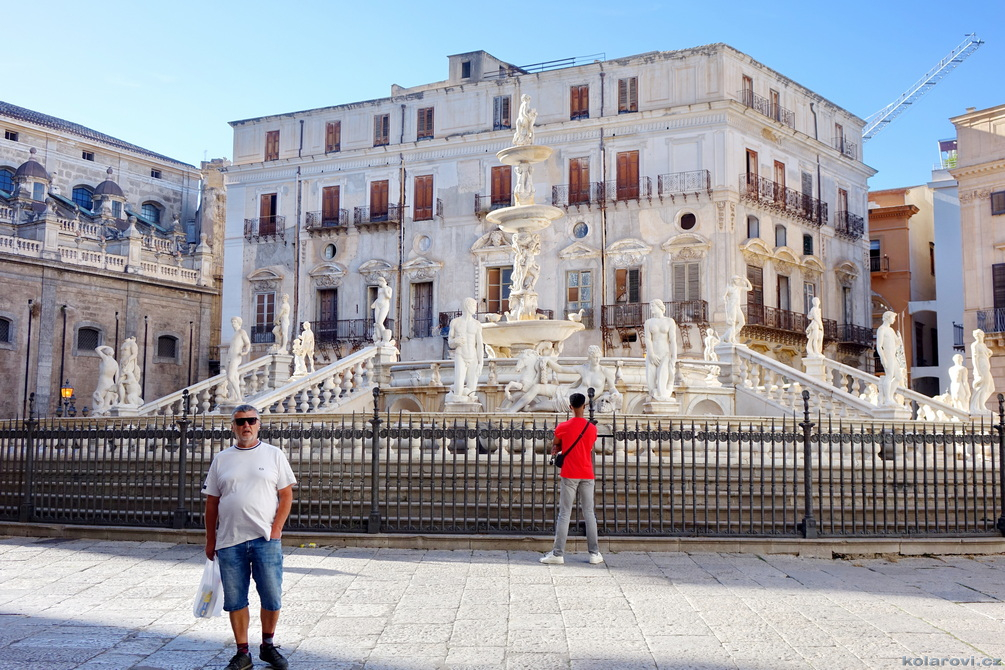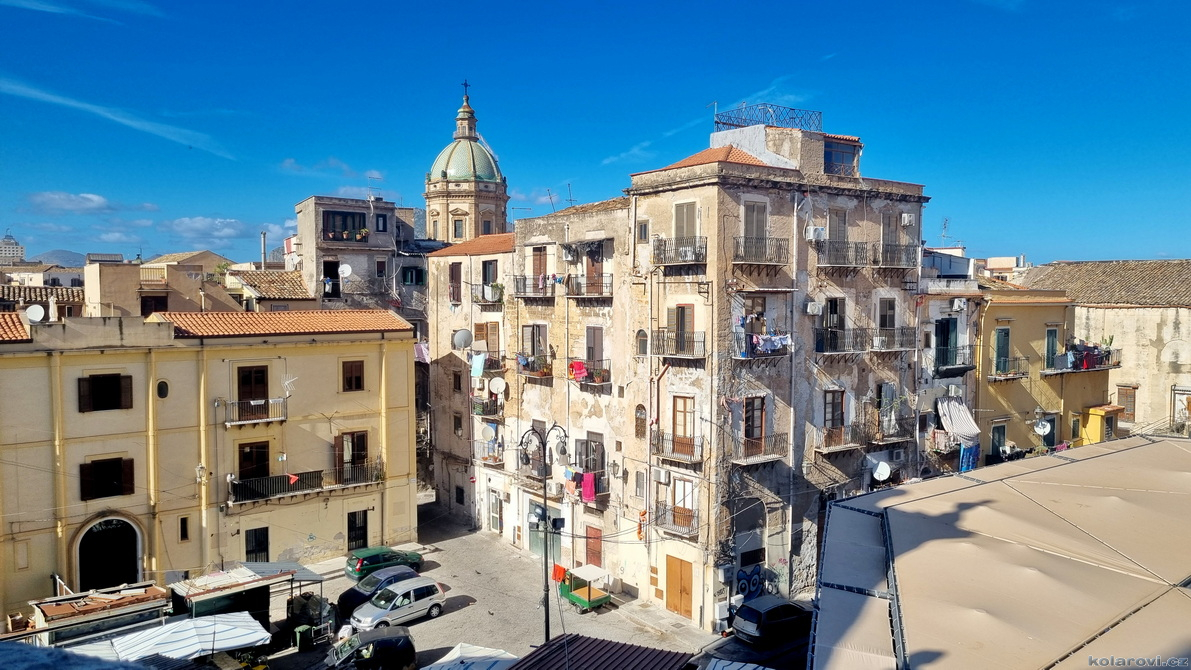 Najedení a spokojení pokračujeme v naší krasojízdě ke kostelu Carmine Maggiore, kde jsme vylezli na zvonici a prohlédli si Palermo z výšky. Úchvatná podívaná! Prošli jsme místním trhem, na kterém převažovalo jídlo všeho druhu a pokračujeme kolem kostela Ježíše Krista (Chiesa del Gesù), známým také jako Casa Professa. Jedná se o nádherný příklad pozdně manýrenistické a barokní architektury v Palermu. Pokračujeme na Via Maqueda, po které jsme došli na Quattro Canti, ikonické osmiúhelníkové náměstí, které je také známé jako „Teatro del Sole“ (Divadlo slunce) díky charakteristickému dennímu osvětlení, je proslulé svými čtyřmi barokními fasádami zdobenými fontánami, sochami ročních období, španělskými králi a palermitanskými patronkami. No a to je pomalu konec prohlídky. Dorazili jsme k "autobusu", trochu nervózní, jak to přežili pejsci. Dopadlo to dobře, Fjord i Zweite vyskočili z kufru jako čertíci, vychlemtali vodu, kterou jsme jim sehnali a my můžeme pokračovat v krasojízdě.