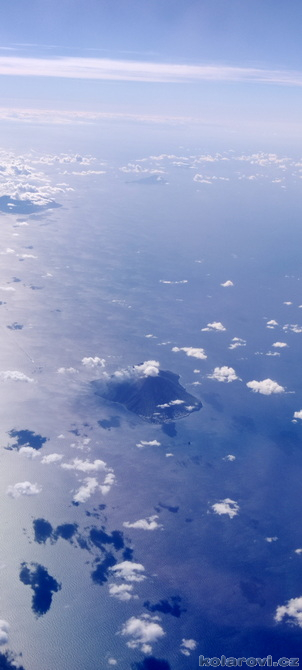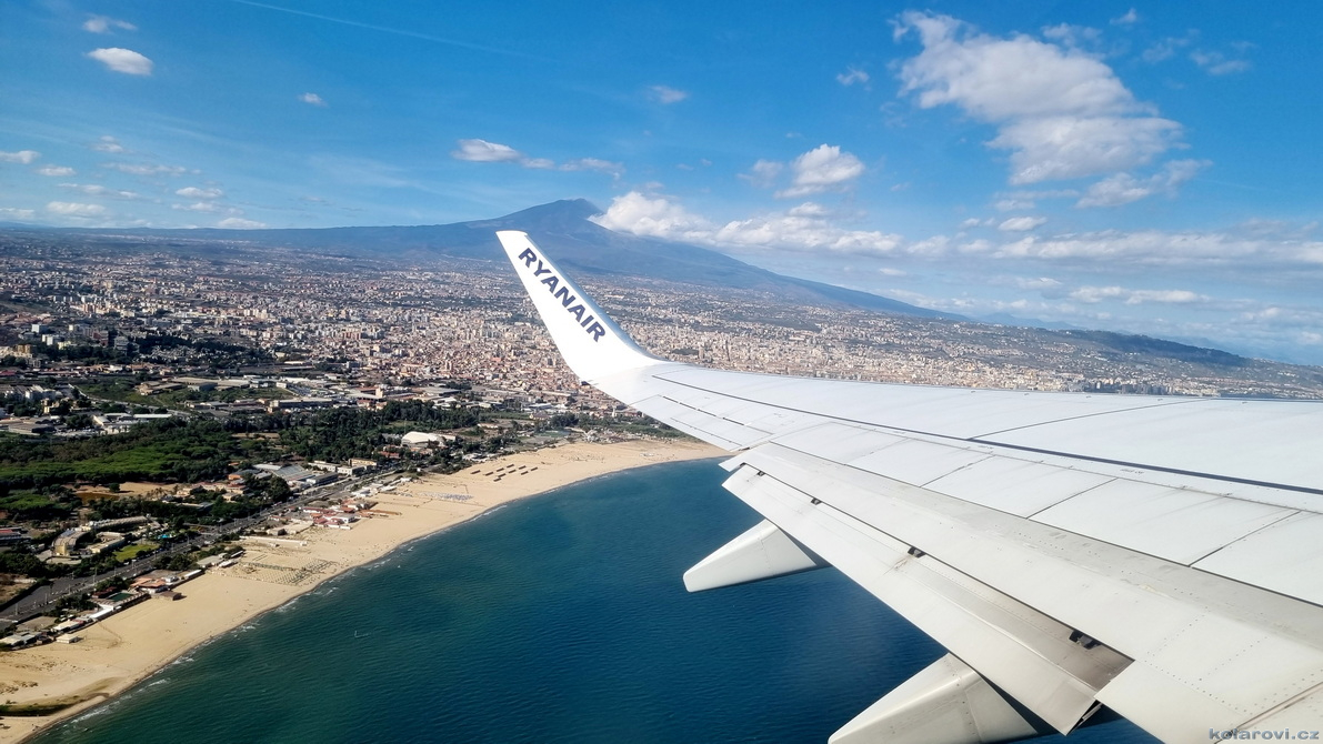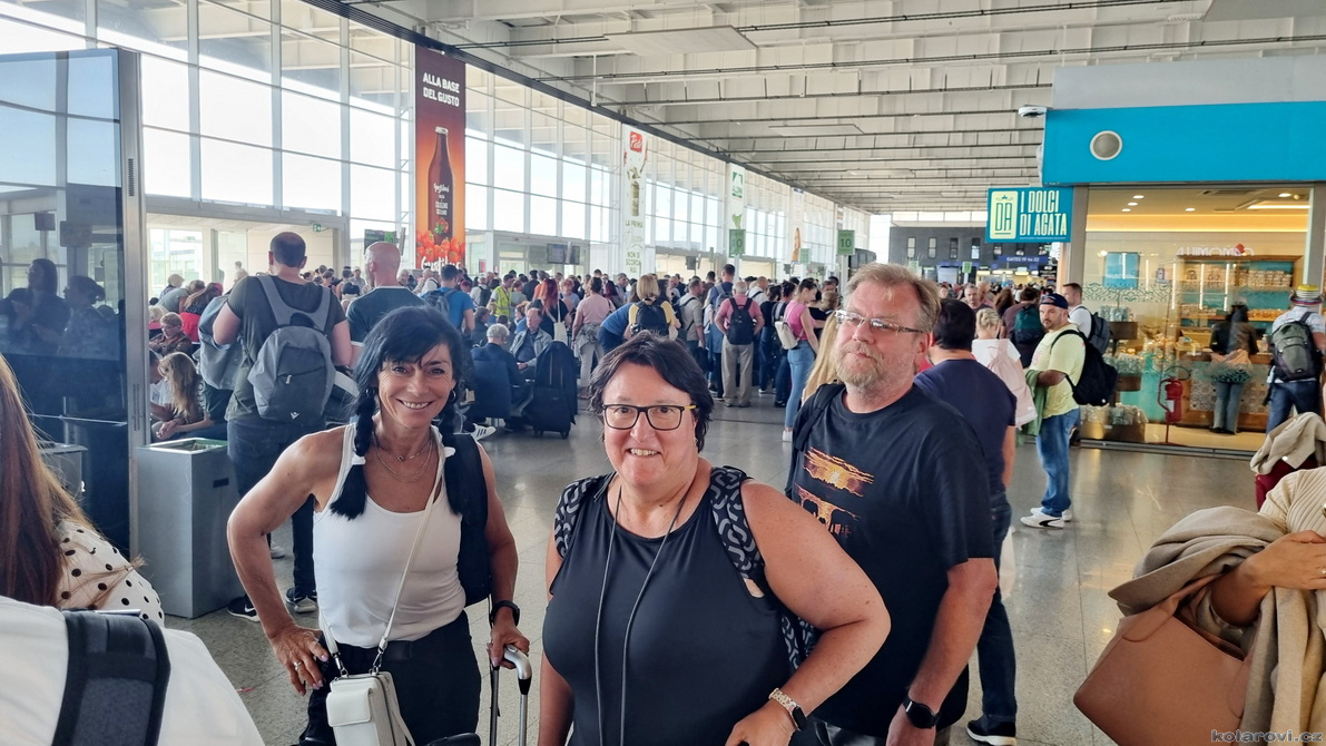 Naposled jsme se vyspinkali a balíme se k odjezdu. Ještě poslední návštěva u Alfonsa v jeho baru Central, odstěhovat zpět půjčenou postel, uklidit (dokonce jsme chytili a s pomocí pejsků zneškodnili nezvaného nájemníka s krysím kožíškem a dlouhým ocasem) a už jenom zbývá cesta do Catanie, kde bude připravené letadlo domů. Karel na letišti vyzvedává svoji manželku, se kterou si bude užívat zaslouženou dovolenou na zotavenou ze zběsilých pěti dní s námi. Na letišti by to samozřejmě nešlo bez klasického italského zmatku, ale nakonec nás šest sedí v letadle a letíme si domů také odpočinout. Z letadla jsem si ještě vyfotil vrchol Etny lezoucí ze šlehačky mraků, po chvíli sopku Stromboli a šmitec...