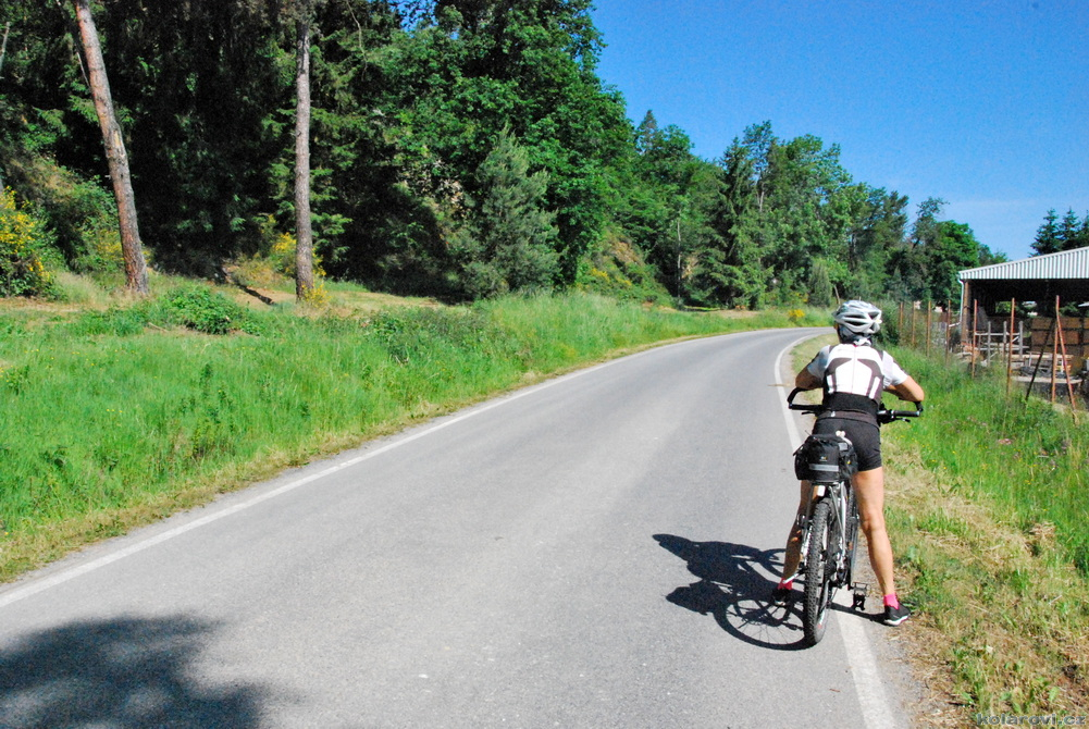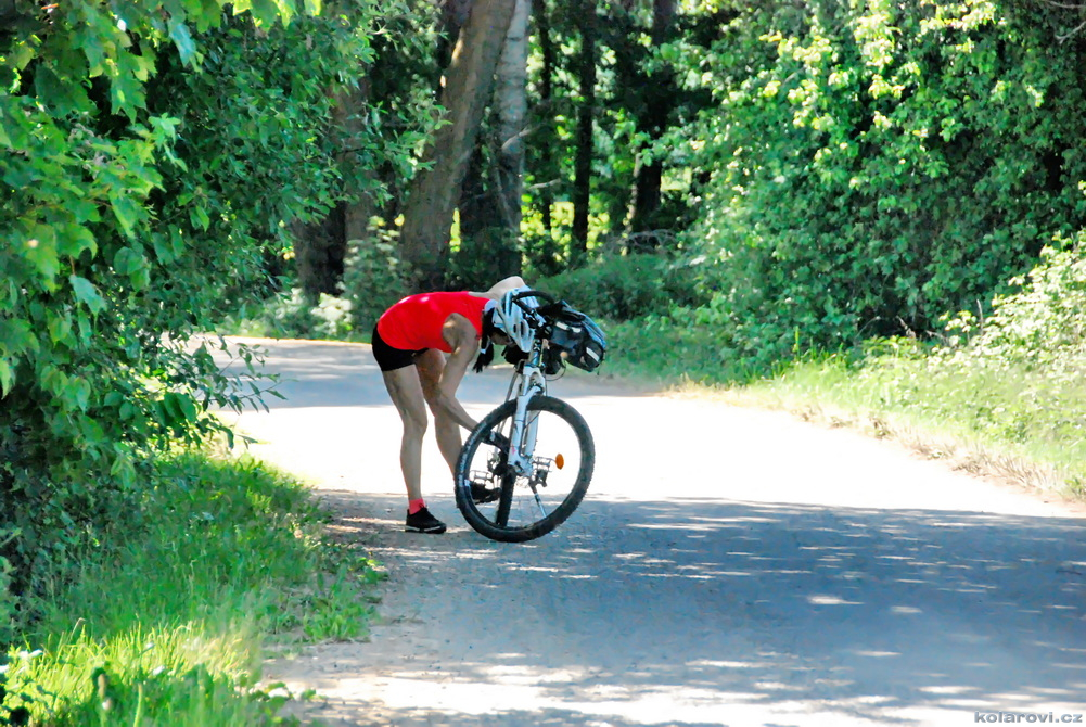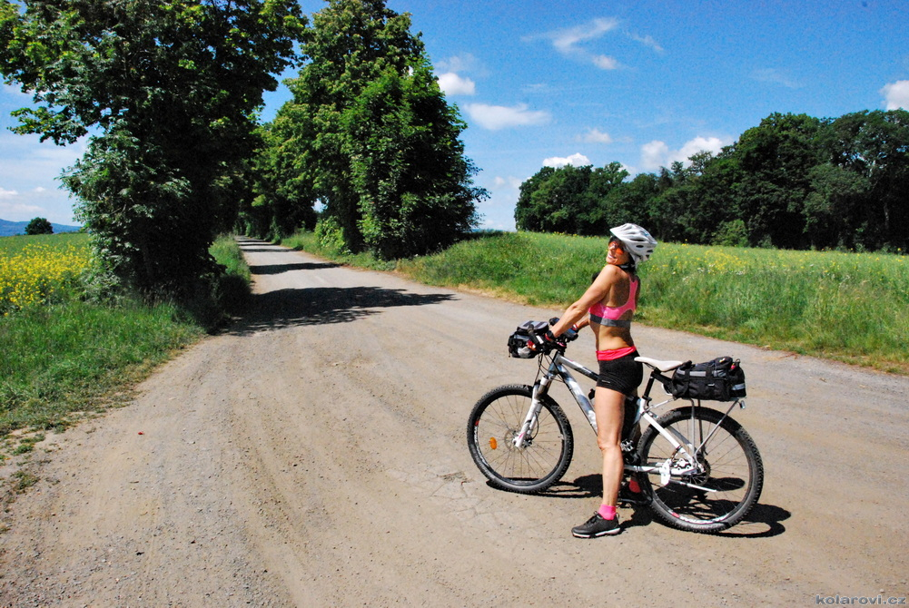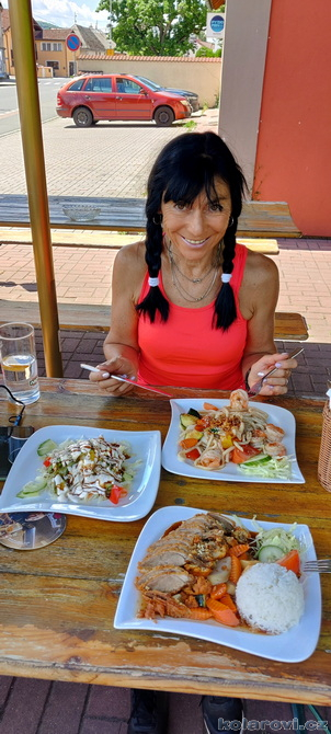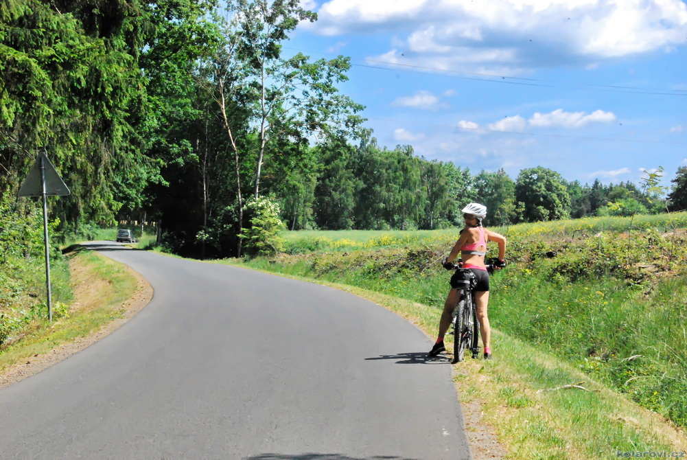 Jedeme podél řeky Zubřina protékající Domažlicemi a zastavili jsme v plánované hospodě se zvláštním názvem, YUMI restaurace U Kocoura. Dobrá asijská kuchyně, obsluha trochu horší, neumí moc česky a vše trochu déle trvá. Jídlo je ovšem více než chutné, dalo by se říci, že výborné. Má to ovšem i stinou stránku, s plným žaludkem nás čeká hned za Domažlicemi nepříjemné stoupání. Protože Zuzanka do mne nacpala i valnou část svých nudlí (já nemohl odolat, protože jídlo bylo opravdu výborné), jelo se mi těžce, nudle mne v žaludku velmi tíží. Ještě se hodně oteplilo, začalo být dusno, chce se mi chvílemi blinkat, musím zastavovat, vydýchávat se, ale nakonec jsem to všechno vyšlapal a víceméně v pohodě dojel.