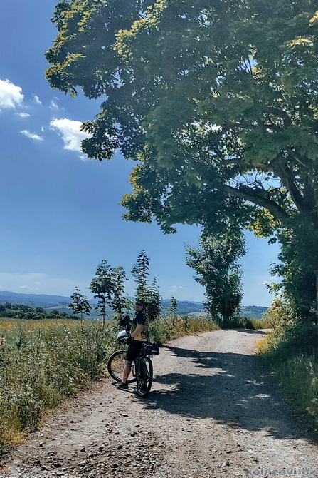 Z Chodova do Klenčí pod Čerchovou jedeme krásnou cestou mezi poli a loukami s krásnými výhledy na kopce Šumavy. V Klenčí měla být hospoda, no byla, ovšem otevřeno až od 14 hodin. Je půl jedenácté. Projeli jsme vesnice, které jsem ani nezaznamenal, kromě Ždánova, kde mne zaujal zdevastovaný zámek, který byl postaven v roce 1730 augustiánským klášterem pro své hosty. Cestou na vrch Baldov jsme odbočili na historický Baldův statek, dnes bohužel už totálně zbouraný, kromě pár zbytků zdí. Baldovský statek u Domažlic z 19. století, byl původně rustikální sídlo lékaře a politika Antonína Steidla. Statek hostil významné osobnosti jako Jana Nerudu a Jaroslava Vrchlického. Po vyvlastnění sloužil JZD a poté romským osadníkům. Dnes je opuštěný a chátrá, ale stále připomíná bohatou historii a zajímavé osudy svých majitelů. Na vrchu Baldov je památník bitvy u Domažlic, který připomíná zdejší husitské vítězství nad křižáky v bitvě u Domažlic 14. srpna 1431. Potkali jsme zde párek důchodců, se kterým jsme si příjemně popovídali. Z vrchu vede Sochařská stezka, která je osázená sochařskými výtvory z různých materiálů. Dojeli jsme až do Domažlic, kde jsme prokroužili náměstí, jeli kolem zvláštního Chodského hradu, založeným Přemyslem Otakarem II. v letech 1260-65. Pozůstatky hradu nechalo město v první polovině 18. století postupně přestavět do dnešní barokní podoby. Z původního hradu zůstala zachována obvodová zeď a válcová věž, která je veřejnosti přístupná a nabízí výhled na okolí. V současnosti se v jeho prostorech nachází Muzeum Chodska.