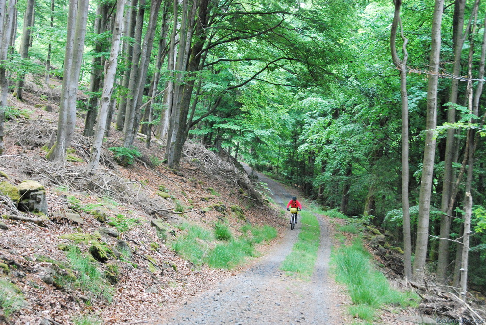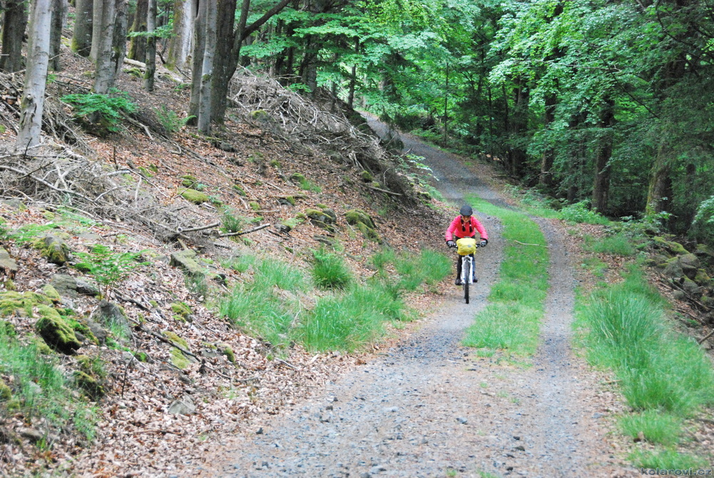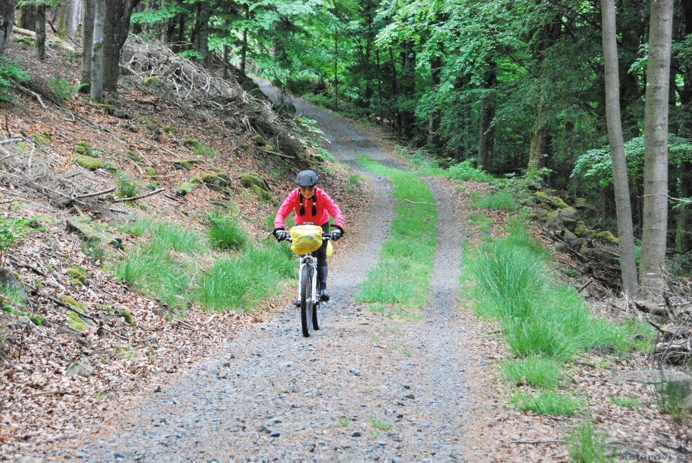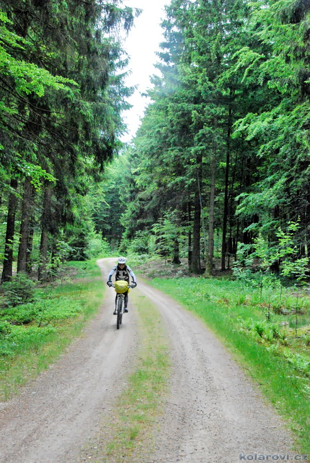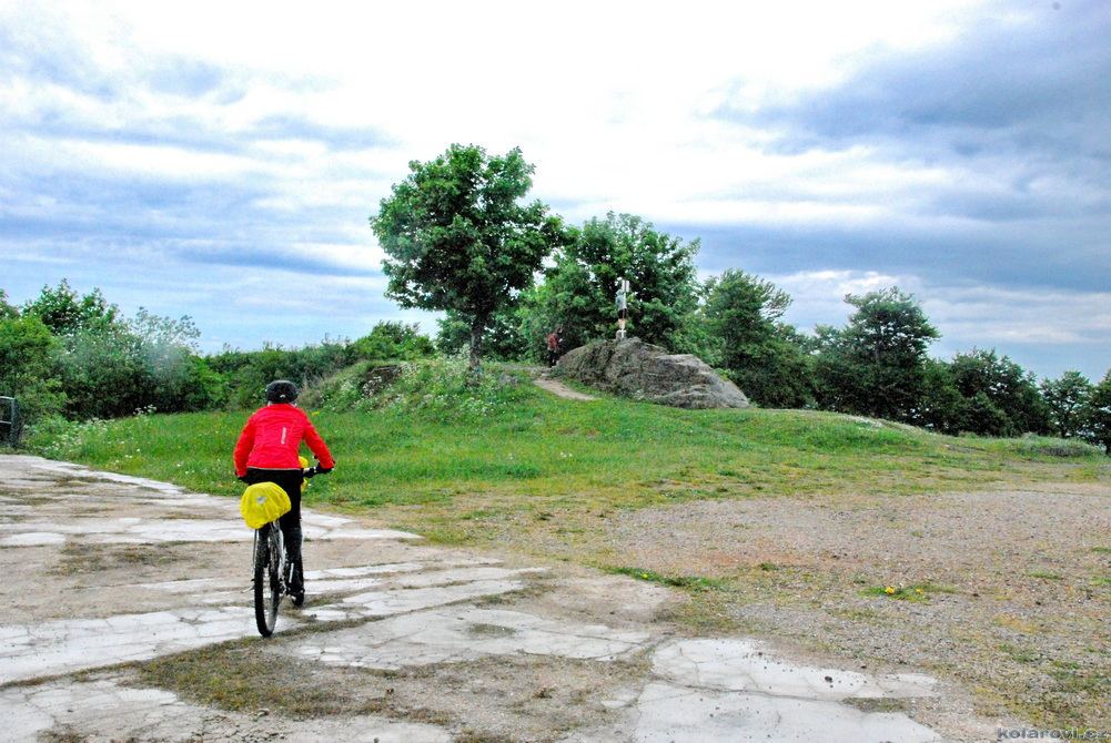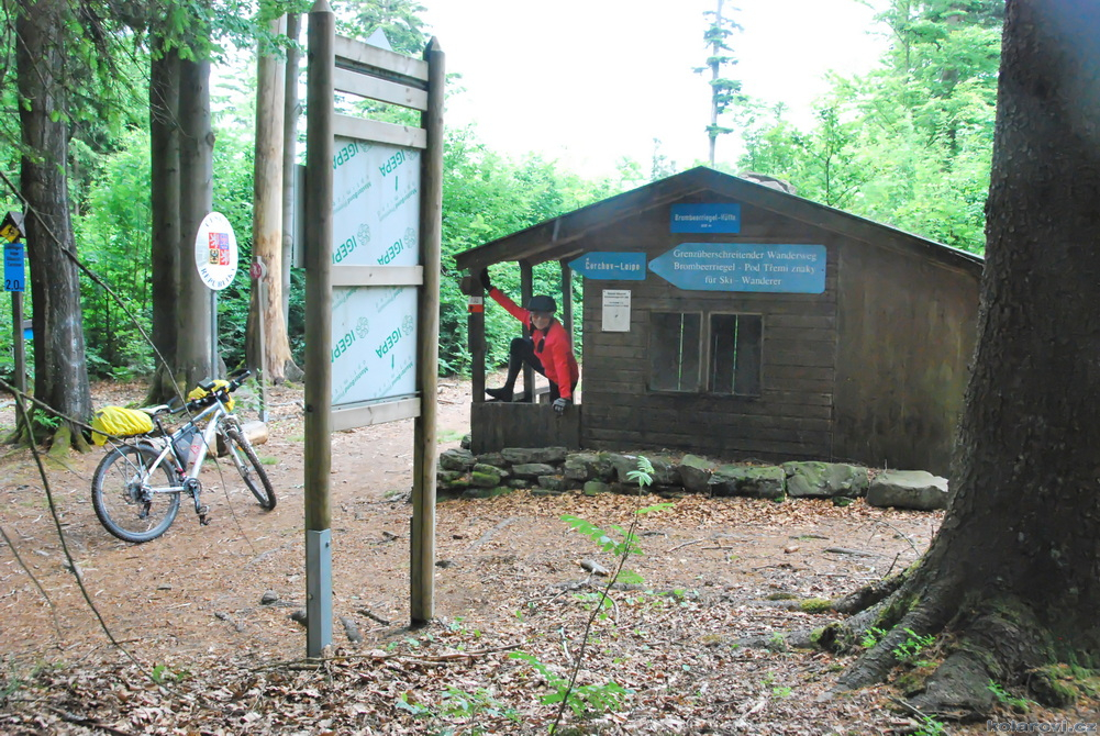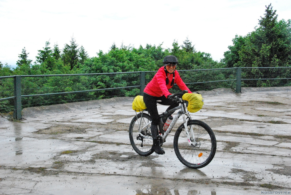 Také dnes pojedeme trochu změněnou trasu, do které jsem zakomponoval výšlap na nejvyšší horu v okolí 1042 m.n.m. Ráno není takové teplo a slunečno jako včera, nicméně ve čtvrt na deset nasedáme na kola a z 512 m.n.m. budeme stoupat na vrchol Čerchov a podle hodnoty v GPS do výšky 1048 m.n.m. Stoupáme, stoupáme a stoupáme. Místy 21% sklon, občas tlačíme, zejména posledních asi 100 metrů těsně pod vrcholem. Uf! Jsme tu a... začalo pršet. Azyl jsme našli v altánku kousek od bistra, kde jsme si koupili pivo a vybornou česnečku. Orazítkoval jsem si deníček turistickými razítky a koupil další přívěšek na mojí přední tašku pro foťák. Pořád prší. Skočil jsem si ještě pro malé pivo, pro Zuzanku vzal zelený čaj a čekáme dokud se déšť nezměnil v mrholení. Zabalili jsme se do protidešťové ochrany a vyjíždíme.