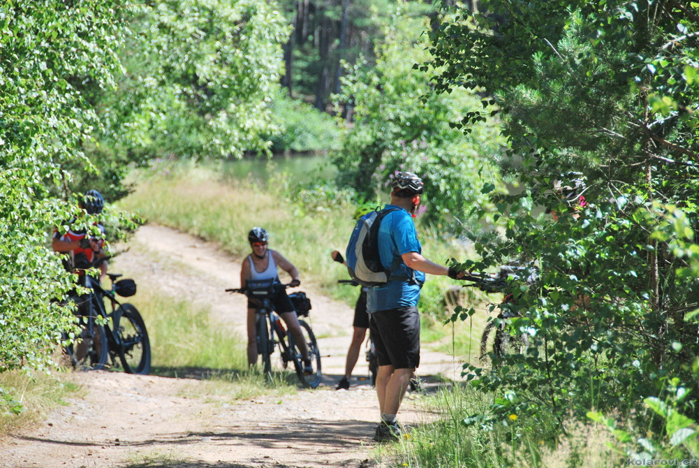 Všechny nenávidím. Nechali mne včera ožrat a ráno mi není úplně dobře. Nicméně v deset jsem na startu a dokonce jsem zvládl výměnu předních brzdových destiček, které mi včera přivezl hodný místní údržbář. Šlape se mi těžce. Lesem do Ostrovce, pak sjezd do Velčína, Blatna, Malměřic, kde se dělíme na dvě skupiny. Zuzanka se mnou a Romanem a zbytek, to je Knobíci, Srnka+Vašek, Sirael+Smolda, si krátí trasu aby se vyhnuli stoupání v lese před Lubencem. Sejdeme se v Kryrech. Kopec nakonec nebyl tak strašný, v lese jsme byli ve stínu a za chvíli vidíme Lubenec, projíždíme ho a vrháme se do výhně na pláně s chmelnicemi. Krátce před jednou hodinou jsme v Kryrech, v jediné hospodě na trase. Hospoda má sice otevřeno, ale paní kuchařka jde zrovna dnes k lékaři a vaří do jedné. Protože je právě 10 minut po jedné, máme smůlu. Někdo si doběhl do vedlejšího COOPu pro bagetu, někteří využili, že hospoda je zároveň prodejna lahůdek a polotovarů (sic!) a koupili si jakýsi "hamgurgr" a nechali si ho ohřát v mikrovlnce. Mezi ty některé patřím i já a musím říci, že docela ušel. Na čepu byl Budvar 10°, takže točené pivo také nebylo. Naštěstí pan "hostinský" měl v lednici lahvové Svijany, což trochu zachránilo situaci.