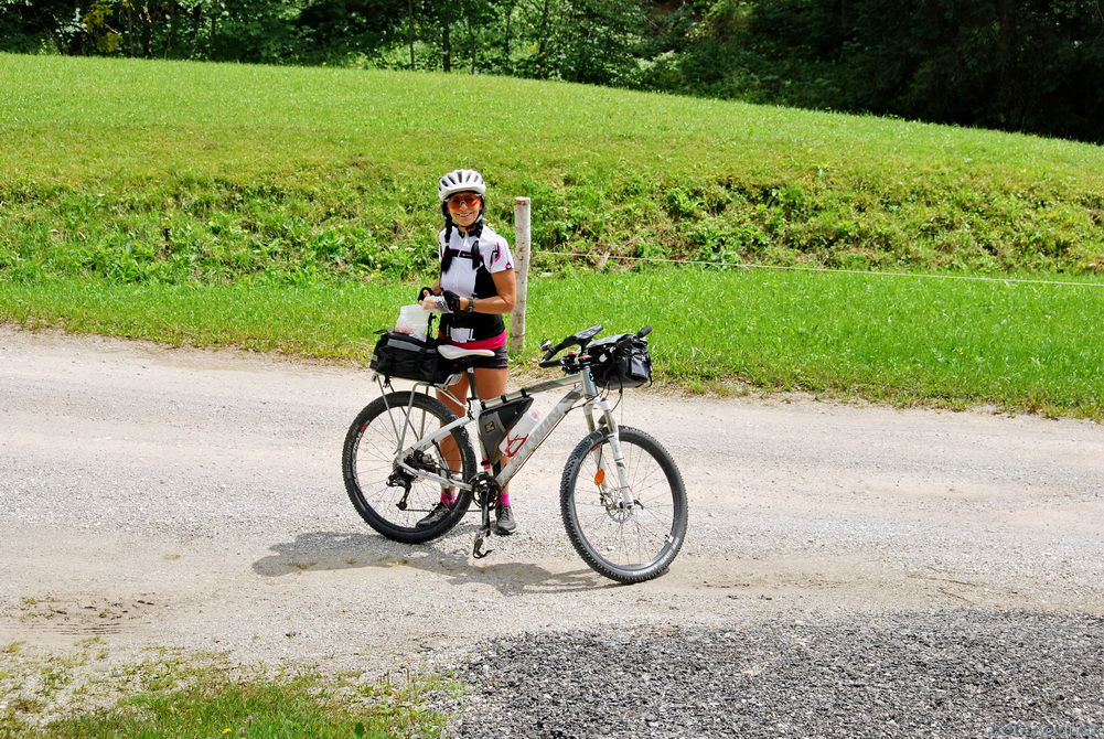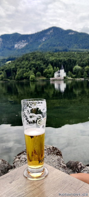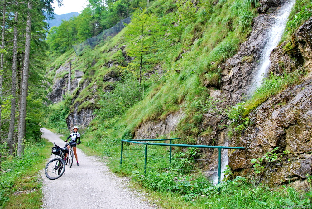 Sedíme v hospůdce Seehotel Grundlsee, pijeme pivo a kafé americano, naproti si prohlížíme krásnou vilu vypadající jako malý zámeček a vychutnáváme krásný klid. Od Grudlesee jedeme ještě k jezru Altauseer a pak následuje nejhorší stoupání celé trasy na kótu 930 m. n. m. Stoupání bylo opravdu strašné, místy jsme tlačili v 17% stoupání v šotolině a rigolech vymletých tekoucí vodou, ale přežili jsme a dospěli k našemu dnešnímu třetím vyvrcholení. Následuje sjezd, sjezd, sjezd... a sjezd až do St. Agathy. To už jsme u Halštatského jezera a začalo pršet. Jedeme podél jezera a Zuzanka pláče, že nemůže fotit, protože má vybitý mobil.